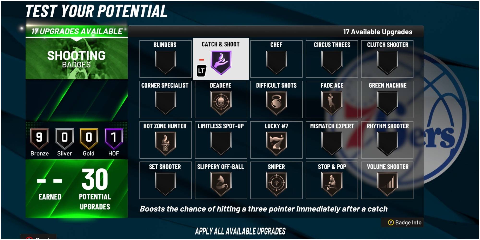 21 Catch and Shoot. A big factor in a players capability as a playmaker stems from his ability to control the rock. This is the perfect example of a badge that will turn you into a Steve Nash.